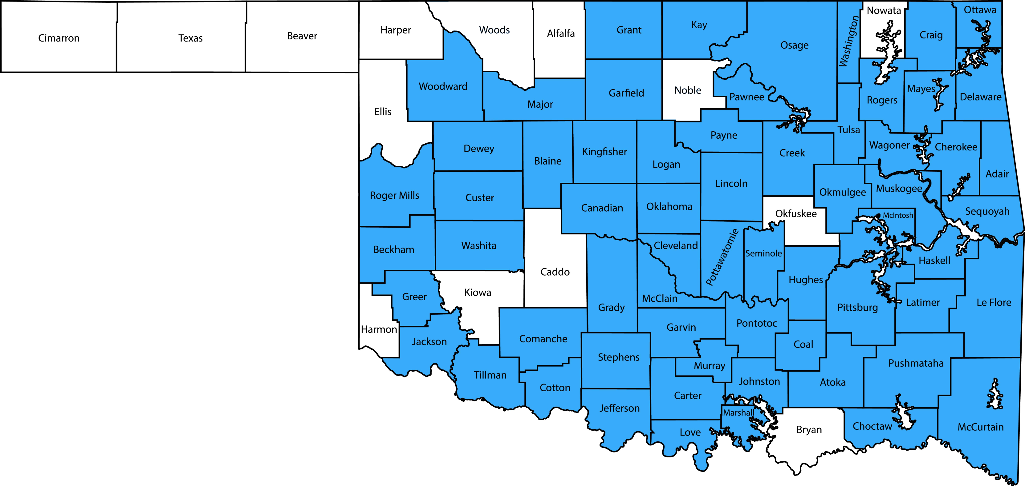 We are dedicated to improving the lives of the children in the Oklahoma foster care system. Our specially trained volunteers strive to become a positive, stable influence for Oklahoma children while ensuring they have a voice in the courts and the services they need for a stable future. CASA programs serve 63 (blue counties) out of Oklahoma's 77 counties.